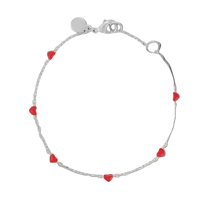 Wear your heart on your sleeve with the Small Crush Bracelet. The dainty red, enamel hearts on a small chain are not only stylish, but they are also water proof and made of durable stainless steel. No need to worry about taking it off in the shower or while washing your hands. This bracelet is perfect for everyday wear and will add a touch of charm to any outfit.